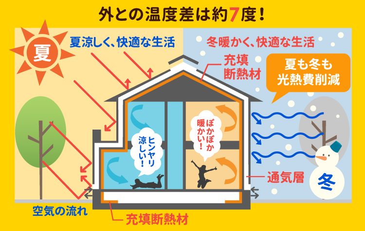 家全体を高断熱でくるむことにより、外気温と室温とは約7度の温度差がある、